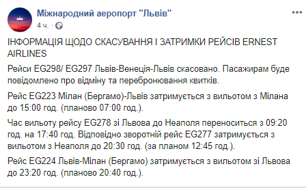 "Рейсы EG298/EG297 Львов-Венеция-Львов отменен. Пассажирам будет сообщено о отмены и перебронирования билетов. Рейс EG223 Милан (Бергамо)-Львов задерживается с вылетом из Милана до 15:00 (планово - 7:00)", - говорится в сообщении.