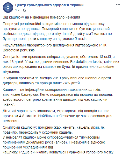 От коклюша в Ровенской области скончался месячный младенец. Об этом сообщается на странице Центра общественного здоровья в Facebook.