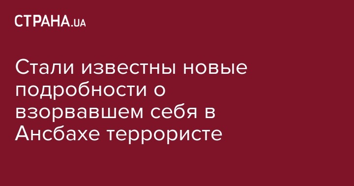 Напомним, что 24 июля в немецком городе Ансбах возле винного ресторана прогремел взрыв. Виновником взрыва является 27-летний сириец, который приехал в Германию 2 года назад и подал прошение об убежище, но год назад ему было в этом отказано. Предполагается, что террорист собирался устроить теракт на музыкальном фестивале, но не смог проникнуть в зрительную зону.