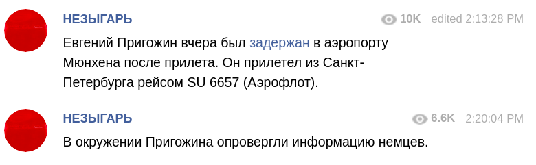 Однако, Telegram-канал "НЕЗЫГАРЬ" пишет о том, что в окружении Пригожина опровергли информацию немцев относительно задержания бизнесмена.