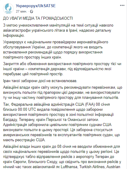 "С целью предотвращения манипуляций на теме ситуации вокруг авиакатастрофы украинского самолета в Иране, предоставляем подробную информацию.