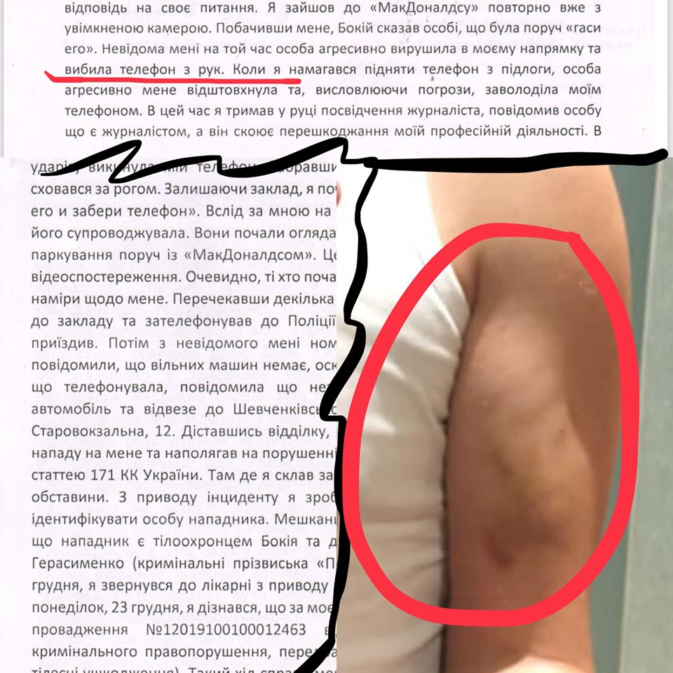 Охранник Бокия нанес журналисту несколько мощных ударов. Полиция квалифицировала дело по ст. 125 - легкие телесные повреждения, зато сам журналист настаивает на переквалификации по профессиональному статье 171 - препятствование журналистской деятельности.