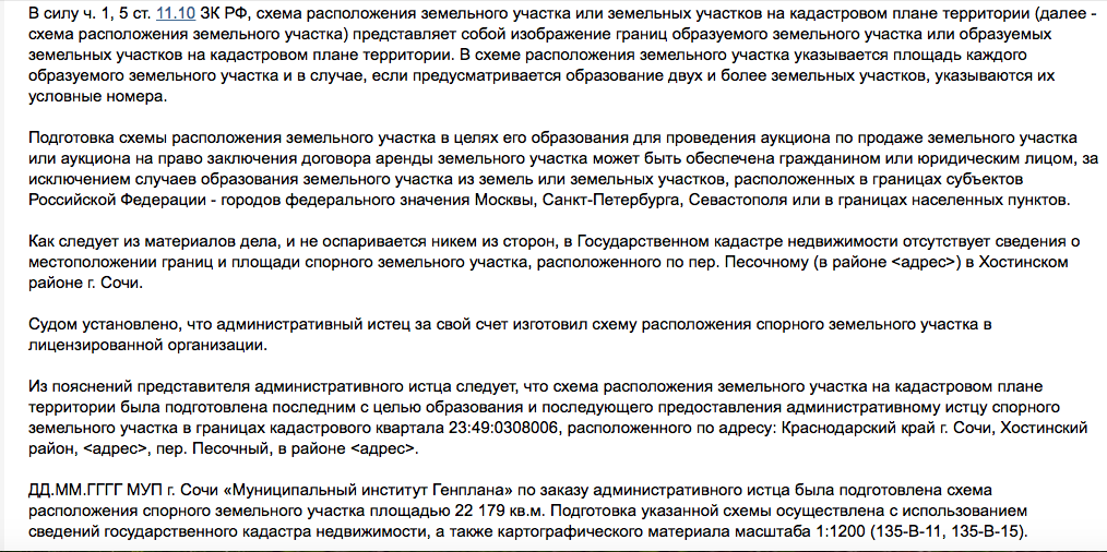 Гражданка Садыкова обратилась в суд по причине отказа "в согласовании схемы расположения земельного участка на кадастровом плане". Речь идет о 22 179 кв.м земли в Хостинском районе города Сочи.