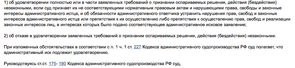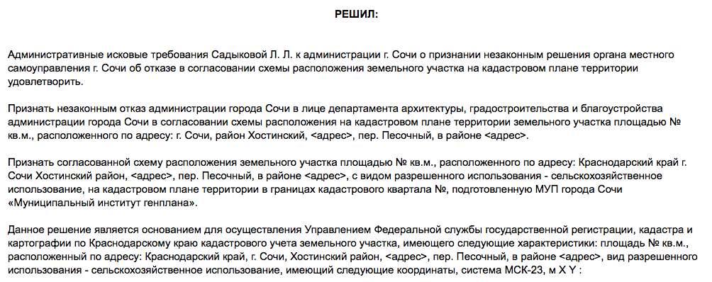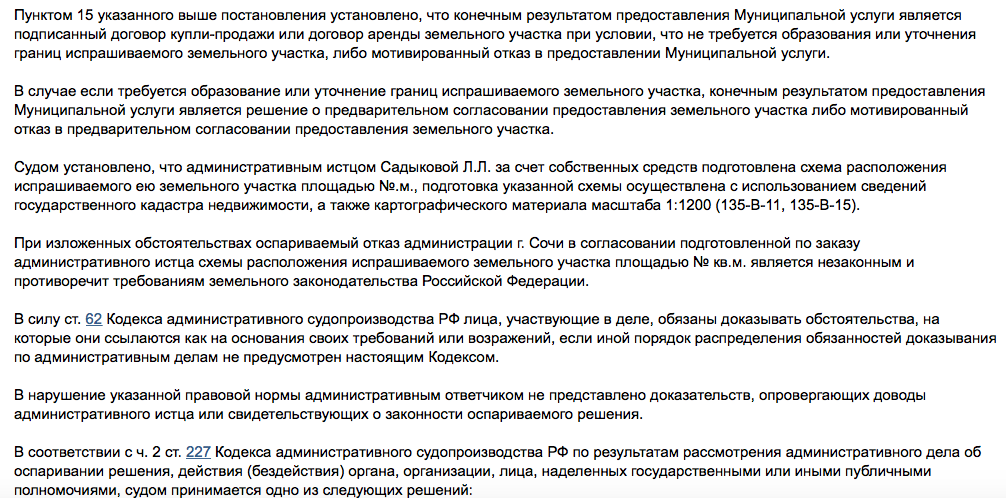 Что касается аргументов сочинской власти в суде - "административным ответчиком не представлено доказательств, опровергающих доводы административного истца (то есть Садыковой) или свидетельствующих о законности оспариваемого решения". Как результат - иск гражданки был удовлетворен. Подробно с решением суда можно ознакомиться ниже.