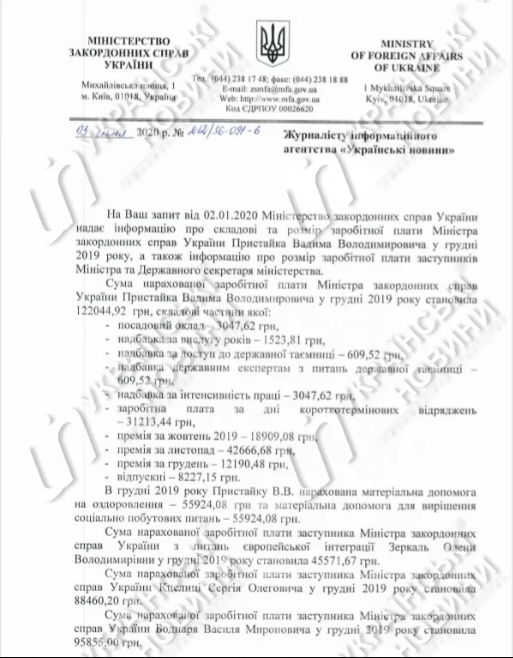 В конце 2019 года министр иностранных дел Вадим Пристайко заработал 234 тыс. гривен, в то время как за ноябрь он получил 68,2 тыс. гривен. Зарплата его заместителей - от 45,5 тыс. до 96 тыс. гривен, государственного секретаря министерства - 128 тыс. гривен.