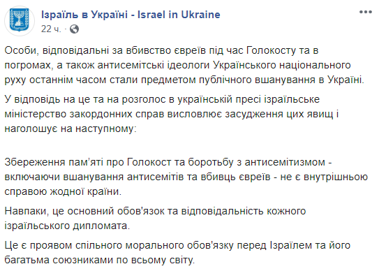 В ответ на это и на огласку в украинской прессе израильское министерство иностранных дел выражает осуждение этих явлений и отмечает следующее: сохранение памяти о Холокосте и борьба с антисемитизмом - включая чествования антисемитов и убийц евреев - не является внутренним делом ни одной другой страны. Наоборот, это основная обязанность и ответственность каждого израильского дипломата. Это является проявлением общего нравственного долга перед Израилем и его многими союзниками по всему миру".