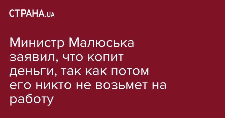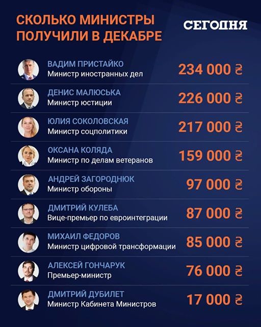 Глава министерства юстиции Денис Малюська, который в декабре 2019 года получил премии за 3 месяца на общую сумму 190 400 гривен и зарплату за декабрь в 226 000 гривен, заявил, что высокая зарплата ему нужна для создания запаса, так как "в течение нескольких лет после увольнения его не возьмет на работу ни одна приличная международная компания". Об этом он сообщил в Facebook.
