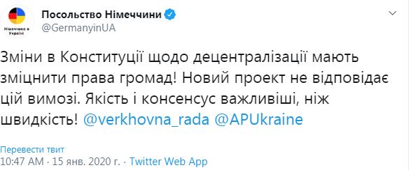 "Изменения в Конституции по децентрализации должны укрепить права общин! Новый проект не соответствует этому требованию. Качество и консенсус важнее, чем скорость!", - заявили в посольстве.