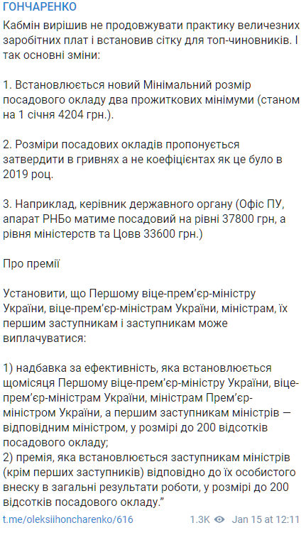 Во время заседания Кабинета министров в правительстве решили отказаться от практики установления больших заработных плат, а их размер решили привязать к суммам в гривне, а не к различным коэффициентам. Об этом сообщается в Telegram-канале нардепа Алексея Гончаренко.