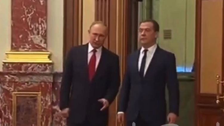 На видео, где отключен звук видно, как президент России Владимир Путин идет с Медведевым по залу Кремля, они разговаривают, потом садятся за стол. Особой радости на лице нет ни у Путина, ни у Медведева.