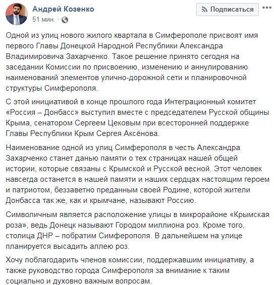 Одной из улиц жилого квартала в Симферополе присвоили имя убитого главы так называемой "ДНР" Александра Захарченко. Об этом в Facebook сообщил депутат Госдумы России из Крыма Андрей Козенко.