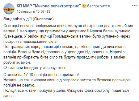 Вечером 13 января в Николаеве трамвай с пассажирами был обстрелян неизвестными. В результате происшествия никто не пострадал. Об этом сообщает пресс-служба КП "Николаевэлектротранс" в Facebook.