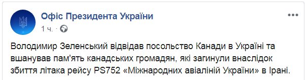 Президент Украины Владимир Зеленский 15 января посетил посольство Канады в Украине и почтил память канадских граждан, погибших при крушении рейса PS752 в Иране. Об этом сообщает в Facebook Офис главы государства.