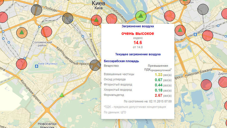 По данным эксперта, обычно в Киеве фиксируется загрязнение воздуха в местах максимально скопления транспорта: "Это Крещатик, Бессарабская площадь, проспект Бандеры, Демеевская площадь. Там по всем показателям концентрация вредных веществ в воздухе, превышает норму в три – четыре раза по всем показателям. Загрязнения воздуха в парках, скверах и на берегу Днепра не зафиксировано".