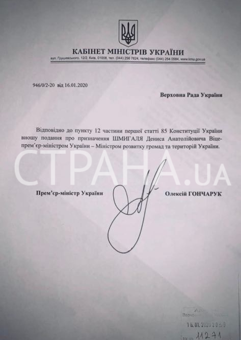 Премьер-министр Украины Алексей Гончарук подал в Верховную Раду представление о назначении вице-премьер-министром Украины -  министром развития общин и территорий Украины Дениса Шмыгаля. Фото документа оказалось в распоряжении "Страны".