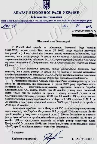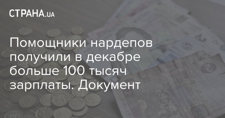 Зарплаты помощников-консультантов некоторых народных депутатов Украины за декабрь 2019 года больше, чем 100 тыс гривен у каждого. Такие большие выплаты получила помощника Ольги Стефанишиной и Анастасии Красносельской - Ольга Жерегина. Также зарплата свыше 100 тысяч гривен у помощницы парламентария Александра Матусевича - Евгении Дзекуновой.