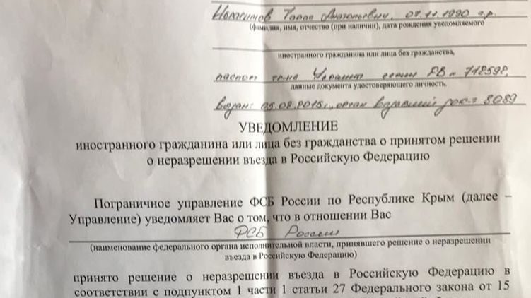 Постановление пограничной службы ФСБ о запрете на въезд. Фото: Тарас Ибрагимов