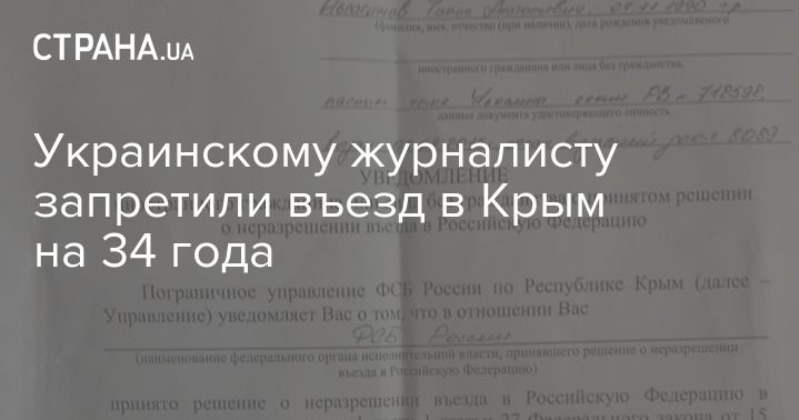 Власти аннексированного Крыма запретили украинскому журналисту Тарасу Ибрагимову въезд на территорию полуострова и России на 34 года. Об этом сообщил сам журналист на своей странице в Facebook.