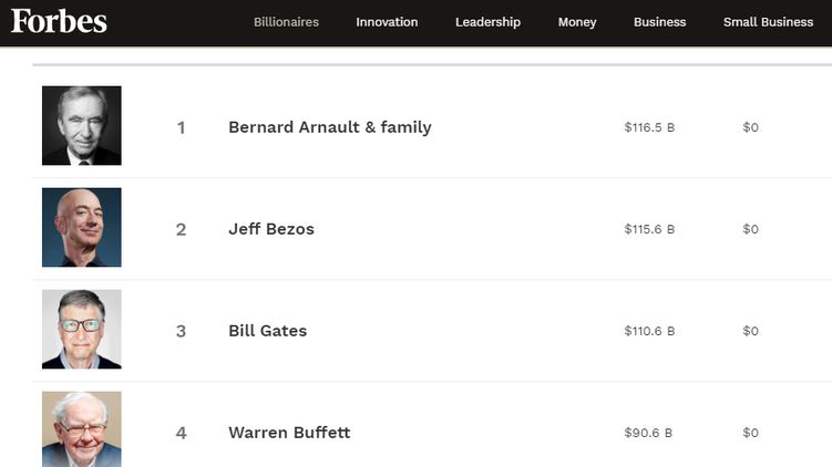 Французский бизнесмен, президент Louis Vuitton Moеt Hennessy (LVMH) Бернар Арно и члены его семьи заняли первую строчку рейтинга багатейших людей мира по версии журнала Forbes.