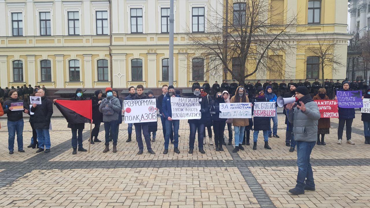 Как сообщает корреспондент "Страны", участие в акции принимают около 20 человек, в руках у них плакаты "Расформируйте полк АЗОВ", "Хватит кормить ультраправых", "Надо расследовать нападения праворадикалов".