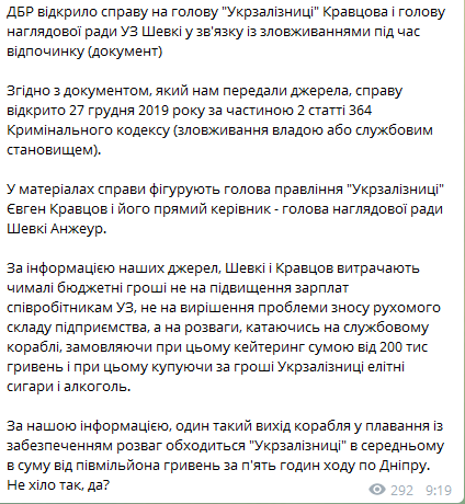 "По информации наших источников, Шевки и Кравцов тратят немалые бюджетные деньги не на повышение зарплат сотрудникам УЗ, не на решение проблемы износа подвижного состава предприятия, а на развлечения, катаясь на служебном корабле, заказывая при этом кейтеринг суммой от 200 тысяч гривен и при этом покупая за деньги "Укрзализныци" элитные сигары и алкоголь",  - говорится в сообщении.