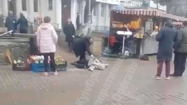 Сегодня в Киеве, неподалеку с входом на станцию метро "Арсенальная", продавец шаурмы избил двух оскорблявщих его парней.