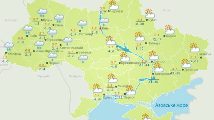 На запад Украины идет потепление, а ее восток содрогнется от ночных морозов. Карта погоды