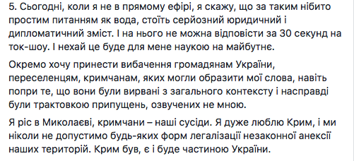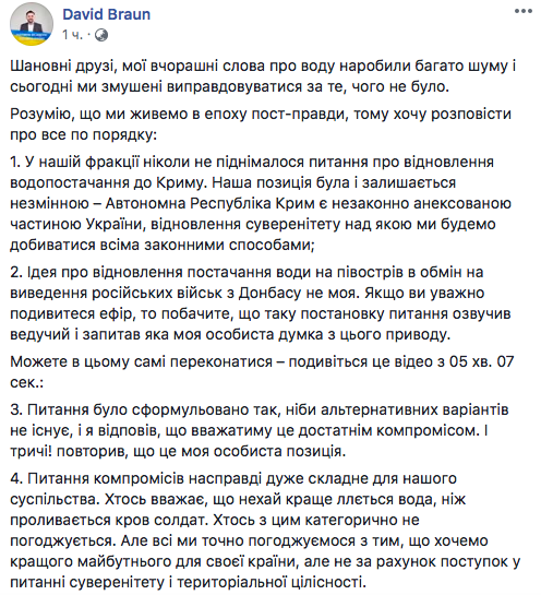 Из конкретики в нем то, что вопрос восстановления водоснабжения в Крым никогда не поднимался во фракции "Слуга народа". А его фрмула "верните Донбасс - получите воду в Крым" были вырваны из контекста. Вообще это лично его позиция, и территорией он торговать не намерен.