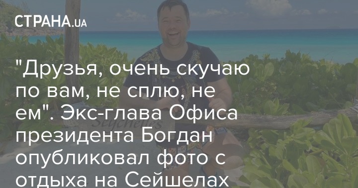 "Друзья, очень скучаю по вам, не сплю, не ем". Экс-глава Офиса президента Богдан опубликовал фото с отдыха на Сейшелах