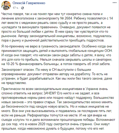 "Честно говоря, так и не понял при чем тут конкретно смена пола и лечение алкоголизма к законопроекту № 2684. Ребенку позволяется с 14 лет вместе с медиками решать свою судьбу и не просто решать, а "укладати та виконувати правочини". Очевидно, документ появился не просто из большой любви к детям. В нем сразу так чувствуется что-то рыночное. Автору законодательной инициативы, возможно, подумалось: пора к рынку и рыночной действительности приобщать подростков.