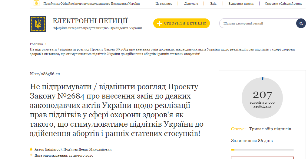 На сайте президента 12 февраля появилась петиция о запрете рассмотрения законопроекта. Его назвали стимулирующим делать ранние аборты. ФИО автора петиции совпадает с ФИО харьковского социолога, который критикует "Слугу народа".