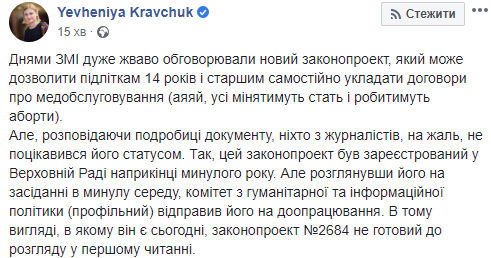 Во фракции слухи о смене пола и абортах по новой инициативе опровергают не слишком активно. Заместитель главы фракции "Слуга народа" в украинском парламенте Евгения Кравчук на своей странице в Facebook написала, что СМИ очень живо обсуждают новый законопроект, который может позволить подросткам 14 лет и старше самостоятельно заключать договоры о медобслуживании.