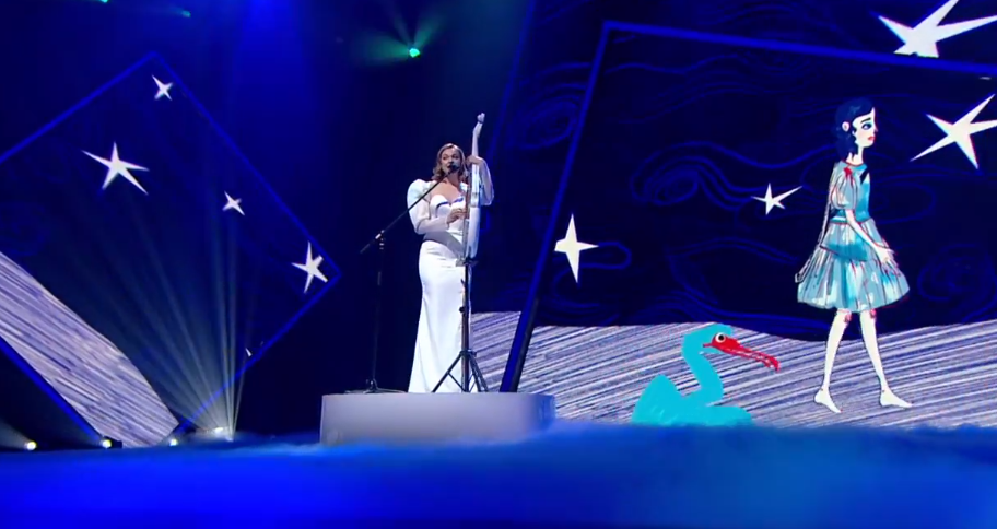Музыкант обращается к зрителям и говорит, что для нее будет честью представлять Украину с таким инструментом. Зал поддерживает ее