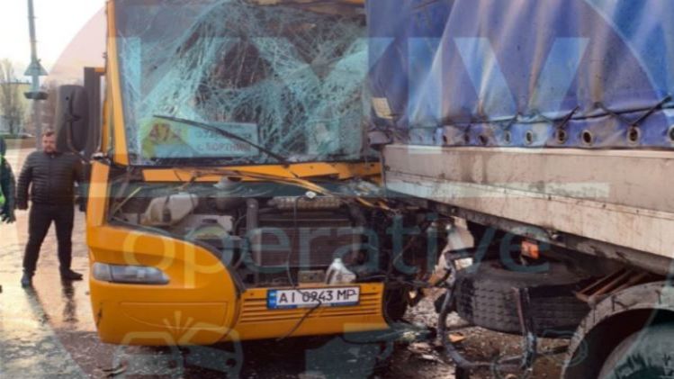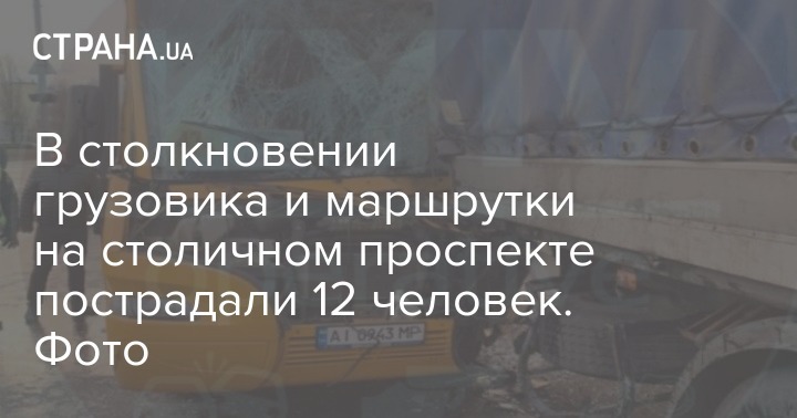 В Киеве на проспекте Николая Бажана водитель маршрутки с пассажирами не справился с управлением и врезался в грузовик. В результате пострадали 12 человек: сам водитель и 11 пассажиров.