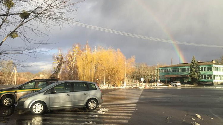 "Первая нынешняя радуга. Вчера (24.02), нашим сотрудникам, работающим в г. Чернобыль, удалось сделать фотографию удивительно широкой и яркой радуги. И все это - в сочетании со снегом, солнышком и дождем", - сообщил там.