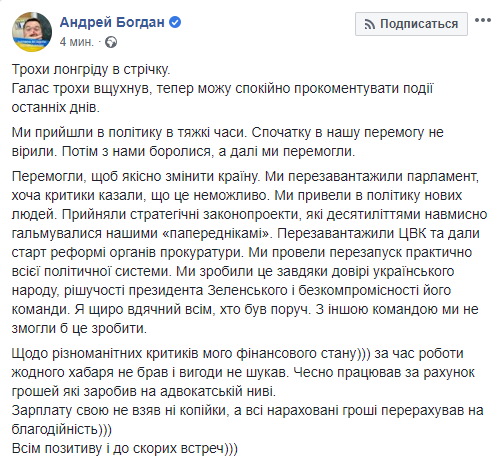 "Мы перезагрузили парламент, хотя критики говорили, что это невозможно. Мы привели в политику новых людей. Приняли стратегические законопроекты, которые десятилетиями намеренно тормозились нашими "папередниками". Перезагрузили ЦИК и дали старт реформе органов прокуратуры. Мы провели перезапуск практически всей политической системы. Мы сделали это благодаря доверию украинского народа, решимости президента Зеленского и бескомпромиссности его команды. Я искренне благодарен всем, кто был рядом. С другой командой мы не смогли бы это сделать", - написал Богдан.