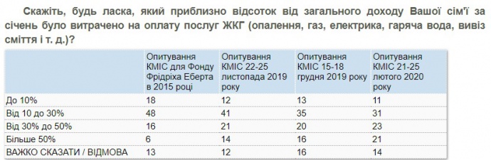 Число украинцев, которые тратят на оплату услуг ЖКХ менее трети дохода семьи в феврале уменьшилась по сравнению с исследованиями ноябре и декабре: 42% в феврале и 53% и 48% в ноябре и декабре соответственно.