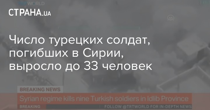 Итак, в результате авиационного удара ВВС Сирии в районе Идлиба погибло уже не менее 33 турецких военнослужащих. О новых уточненных данных сообщает Twitter турецкого агентства Anadolu.