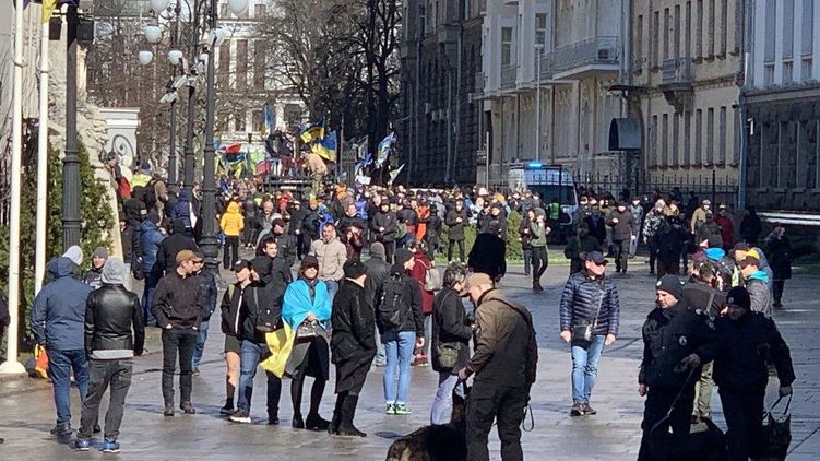 Так, люди скандируют "Зелю геть". Многие из них кашляют и чихают. При этом к зданию стягивают силовиков – пока их не особо много, однако все в масках. Среди активистов тоже есть люди с масками, но процент людей без защиты остается достаточно высоким.