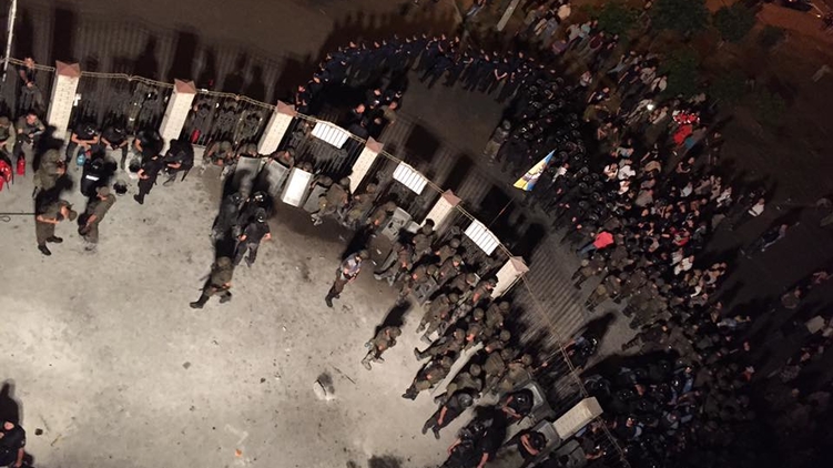 Между протестующими и нацгвардейцами возникла стычка, в ходе которой правоохранители применили слезоточивый газ, после чего в их сторону полетели дымовые шашки и петарды. Через несколько минут противостояние прекратилось, протестующие были оттеснены.