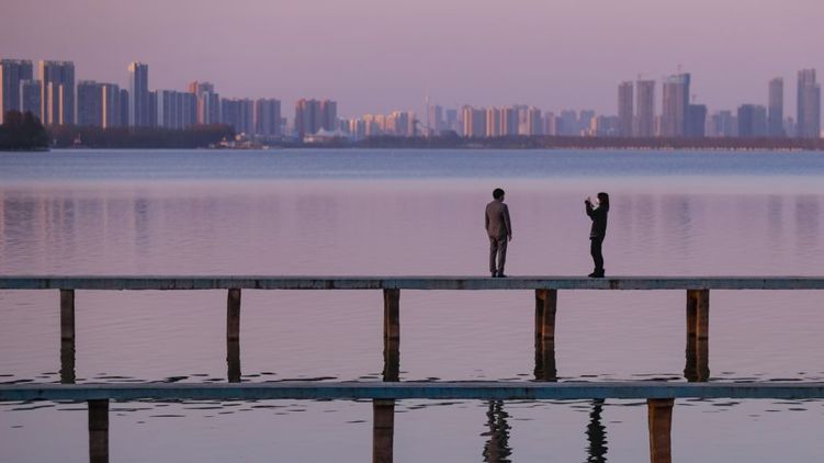 Жители Уханя наслаждаются закатом на мостике через озеро Дунху, фото: news.cn