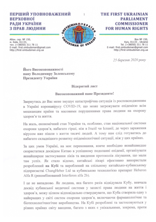 Вице-президент Европейского института омбудсмена, первый омбудсмен Украины Нина Карпачева просит президента Владимира Зеленского привлечь к лечению коронавируса в Украине кубинских специалистов и позволить закупки на Кубе лекарств, которые были признаны эффективными для лечения больных в Китае.