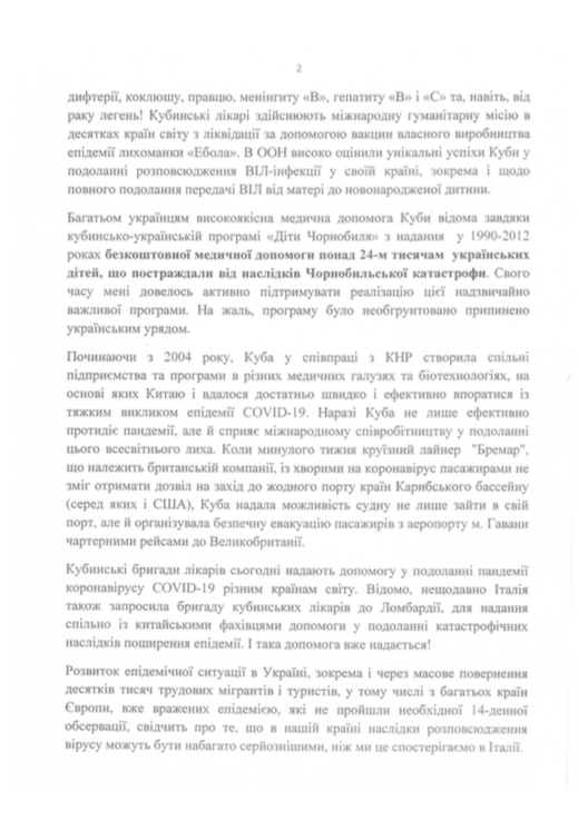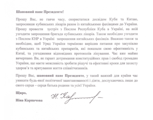"Украине, по моему убеждению, крайне необходимо как можно скорее воспользоваться опытом Китая в успешном преодолении эпидемии, организовать широкое использование лекарств и введение протоколов лечения, которые имели там успех. Как стало известно, китайские врачи эффективно использовали разработанный на Кубе и изготовленный на совместном китайско-кубинском предприятии ChangHeber Ltd по кубинской технологии препарат Heberon Alfa R (рекомбинированный Interferon Аlfa 2В)", - говорится в обращении Карпачевой.