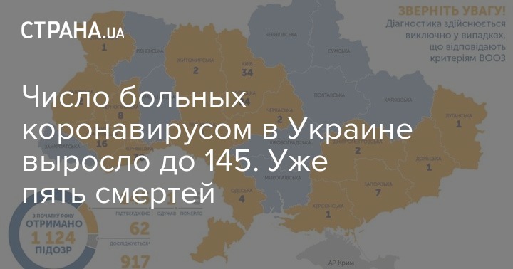 По данным ЦОЗ, по состоянию на 22:00 среды в Украине 145 лабораторно подтвержденных случаев COVID-19, из них 5 летальных. (в тоже время, этот показатель не включает женщину в Конотопе, которая умерла сегодня - ее диагноз МОЗ еще не подтвердил). Один пациент выздоровел. За сутки выявлены 32 новых случая.