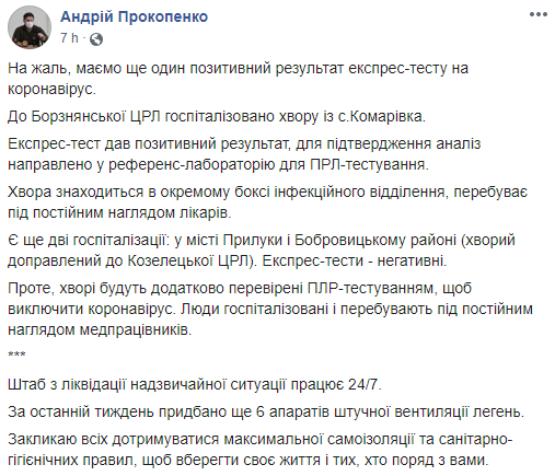 "К сожалению, есть еще один положительный результат экспресс-теста на коронавирус. В Борзнянскую центральную районную больницу госпитализировали больную из с.Комаровка. Экспресс-тест дал положительный результат, для подтверждения анализ направлен в референс-лабораторию для ПЦР-тестирования", - написал Прокопенко.
