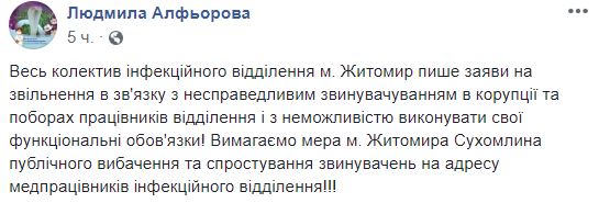 "Весь коллектив инфекционного отделения Житомира пишет заявления на увольнение в связи с несправедливым обвинения в коррупции и поборах работников отделения и с невозможностью выполнять свои функциональные обязанности! Требуем мэра Житомира Сухомлина публичного извинения и опровержения обвинений в адрес медработников инфекционного отделения", - написала Людмила Алферова