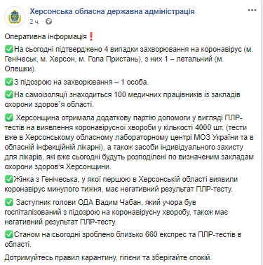 Как сообщает Херсонская областная государственная администрация, всего в о области выявлено четыре случая заболевания Covid-19 в разных населенных пунктах. Один из зафиксированных случаев имел летальный исход (речь о медсестре из Олешек). На самоизоляции находятся 100 медработников.