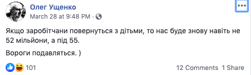 "Если заробитчане вернутся с детьми, то нас будет снова даже не 52 миллиона, а под 55. Враги подавятся", - иронизирует Олег Ущенко.