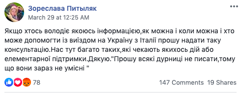 "Как можно и когда можно и кто может помочь с выездом в Украину из Италии? Прошу предоставить такую консультацию. Нас тут много таких, которые ждут каких-то действий или элементарной поддержки", - написала Питыляк в Facebook 29 марта, уже после анонсированного закрытия границы.