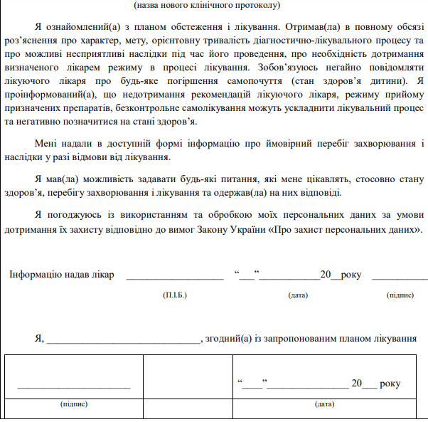 В протоколе два документа. Первый - это форма, которую подписывает пациент с Covid-19. В ней говорится, что он проинформирован и дает согласие на проведение диагностики и лечения согласно протоколу МОЗ.